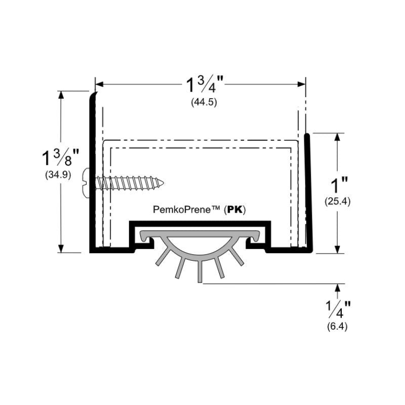 The Pemko 222APK Door Bottom Shoe is equipped with an Offset Channel of 1-5/8 Inch-11/4 Inch Height and is designed to fit a door thickness of 1 3/4 inches. It features a Prene Insert and comes in a Mill Finish Aluminum.